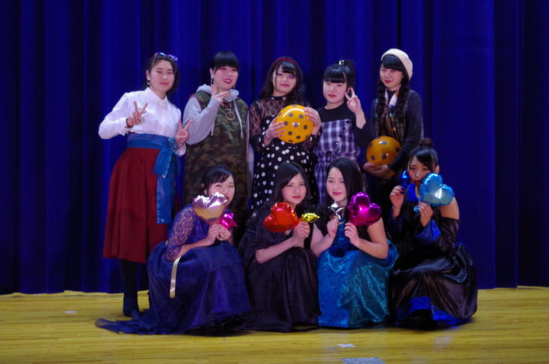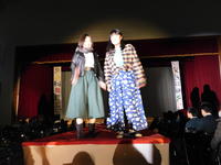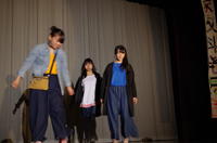 家政科2年 被服コースの発表は,オリジナルワンピースのファッションショーです。10人の生徒が,思い思いのデザインで製作しました。カジュアルなデザインからちょっぴり背伸びしてフォーマルな装いまでスタイルは様々。