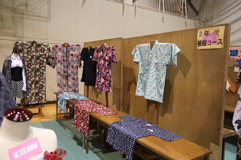 展示コーナーには,甚平や浴衣の作品展示を行いました。最近では縫える人が少なくなってきた和裁も学んでいます。
