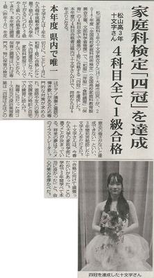 「家庭科検定『四冠』を達成/松山高3年十文字さん/4科目すべて1級合格」