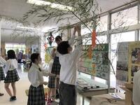 り付けをました。また,家政科3年生が「子どもの発達と保育」の授業で吹き流しを創作して飾り,いっそう華やかな七夕飾りになりました。