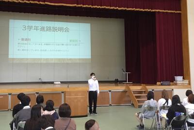 当日は,感染対策を行い二つの会場に分かれて実施しました。説明会では,普通科・家政科・生徒会執行部それぞれの生徒が,高校生活や授業の様子について紹介してくれました。