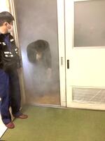 さらに、今回は煙が充満した部屋からの避難を体験する「煙中体験」も実施しました。生徒たちは、明るい時間帯でも、室内に白煙が充満すると視界がなくなってしまうことに驚いた様子でした。