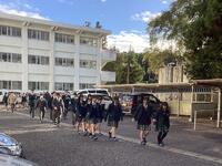11月8日(金)、火災を想定した避難訓練を行いました。出火場所等の位置関係を考えて、授業を担当する先生の誘導のもと落ち着いて校庭に避難しました。続いて、消防署職員の方のご指導で消火訓練を行いました。
