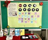 何人かの先生と生徒たちが掲示板の前で,「うーん,何だろう・・・」「漢字一文字でしょ