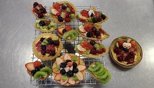 ご覧ください!トッピングに時間をかけた甲斐あって,お菓子屋さんのショーケースに並んでいそうな出来栄えですね。仕上げにゼリーをかけると,キラキラと美しい仕上がりになるのだそうです。同じ素材で作っても,トッピングによって,違うイメージに仕上がります。生徒たちは,お互いの作品を興味深く見比べて,研究している様子でした。