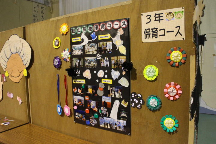 展示コーナーでは,ペープサートの作品や,保育技術検定の際に製作した造形作品,保育実習等のでの写真展示を行いました。また、文化祭でのテーマパーク「松高ジブリランド」の再現展示は、来場した子どもたちにとても人気でした。