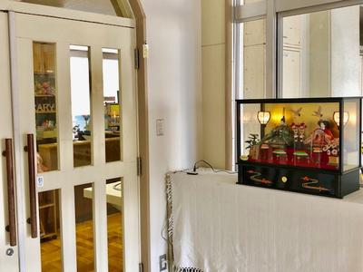 さて,いま校舎内にはおひなさまが飾られています。図書館前には親王飾り,職員室近くの廊下には立派な7段飾りが,生徒たちの目を楽しませてくれます。
