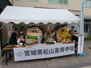 7月22日に大崎市鹿島台で行われた「笑じフェス」に,松山高校の家政科も出店しました。会場となった通りには「松山高校コーナー」が設けられ,家政科調理コースの生徒が自慢の腕を振るいました。今回,販売したのは,「もつ鍋」「キムチ鍋」「ありがとまと鍋(トマト鍋)」の3種類。たくさんのお客様にお越しいただきました。
