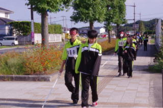9月22日(金曜日),先日の盲導犬体験実習に引き続き,1年生は白杖体験実習を実施しました。2人1組になり,1人はアイマスクをし,1人は歩く相手の補助をしながら順番に学校近辺のコスモスロードの長い距離を歩きました。