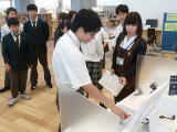 その後,地元鳴子の杉材をふんだんに使った館内を案内していただきました。生徒は,様々なコーナー展示や,利用者の年齢層やテーマごとに特徴のある空間,そしてたくさんの本に興味深そうに見入っていました。特に,一般の人は入ることができない書庫では,整然と並んだ可動式書架に圧倒された様子でした。