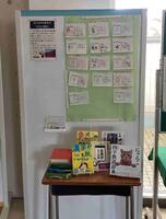 この日は、児童クラブの代表の方が、子どもたちが書いてくれたお礼や感想などの言葉や、イラスト、折り紙などをちりばめたメッセージの掲示物を届けて下さいました。そこで、急きょ図書委員等の生徒たちが集まって、贈呈式を行いました。子どもたちのかわいい手書きのメッセージに、生徒たちは大喜び。図書館前に掲示すると、登校する生徒たちが立ち止まっては読んでいました。