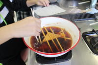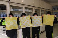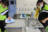 2年生が『家庭総合』の授業において,玉ねぎの皮染めを行いました。生徒それぞれが玉ねぎの皮を煮出したものに,布を入れ,自分がイメージする模様を考えながら割りばしを使って結び目などをつけ,染めました。その後,新聞に挟み,その上からアイロンがけをして完成です!できた布は生徒全員が修学旅行の際,各自のカバンに結ぶようです。2学年の先生方も生徒同様に頑張っていました!