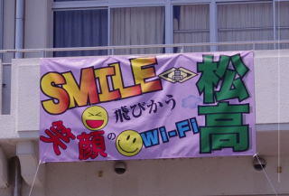 「SMILE松高~笑顔のWi-Fi飛びかう学校~」。これは本年度の松山高校生徒会の運営方針です。もっと明るく,笑顔あふれる松山高校を作っていこう!というメッセージを,校舎に大きく掲げ活動を広げていこうというアイディアがもち上がり,生徒にデザインを募集していました。