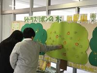 2月16日の朝には、保健委員が校内放送で「『おかえり』『ただいま』と声を掛け合える学校にしましょう!」と呼びかけ、全校生徒にリボンを配布しました。放課後には、賛同した生徒が図書館前に掲示した「シトラスリボンの木」に貼り付け、今、3本の大きな木にはリボンの花がたくさん咲いています。