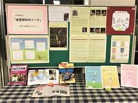 図書館前では,劇団の皆様からいただいたメッセージや関連図書の展示を行っています。