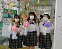 り付けをました。また,家政科3年生が「子どもの発達と保育」の授業で吹き流しを創作して飾り,いっそう華やかな七夕飾りになりました。