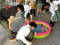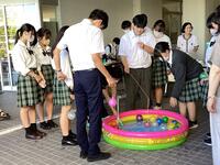 今日は図書館を飛び出して、外(ピロティ)で、なつかしい夏祭り風に。恒例のヨーヨーつりは今年も大人気でした。そして「釣る」より「風船を作る職人」の生徒が多くてびっくりでした。みんな上手です!!!