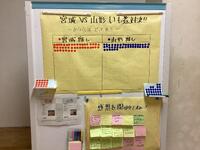 11月15日(金)のほっこりカフェでは、実際に「山形の芋煮」と「宮城の芋煮」を食べ比べてみようという企画でした。自分の好みの方に投票しました。結果は、わずかな差で宮城風が人気でした。