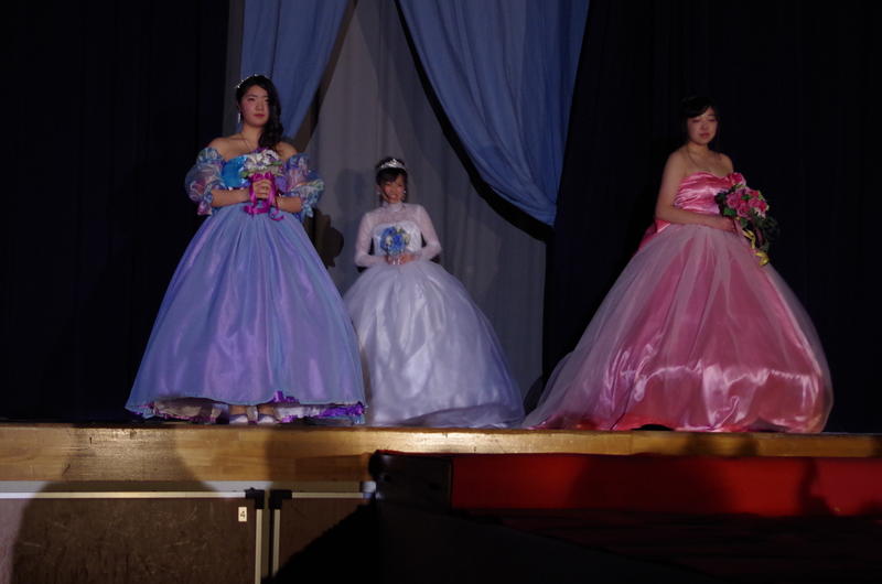 発表会のフィナーレを飾ったのは,家政科3年被服コースのファッションショーです。卒業製作の「ウェディングドレス」を身にまとい,スポットライトを浴びてランウェイを歩きました。