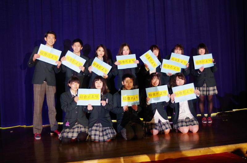 家政科3年調理コースの13名によるステージ発表は,「給食だより」です。小中学校で毎日食べ,みんなが大好きだった学校給食について研究発表を行いました。学校給食の歴史や各国の給食事情,ご当地メニュー,時代背景と栄養価の関係など,様々な視点から学校給食に焦点を当てました。