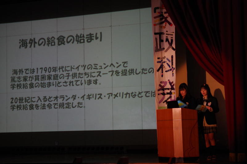 家政科3年調理コースの13名によるステージ発表は,「給食だより」です。小中学校で毎日食べ,みんなが大好きだった学校給食について研究発表を行いました。学校給食の歴史や各国の給食事情,ご当地メニュー,時代背景と栄養価の関係など,様々な視点から学校給食に焦点を当てました。