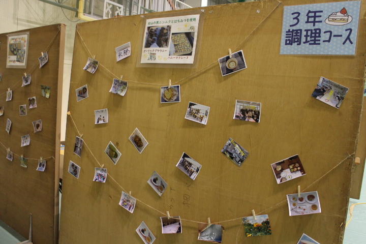 展示発表では,調理実習で作ったプロ顔負けの料理,文化祭「高校生レストラン」でのメニュー,松山の邑まつりで振る舞った,地元松山産のハチミツや黒ニンニクを使用したオリジナルのスウィーツ等,これまで学校や地域で活動してきた成果を写真展示しました。