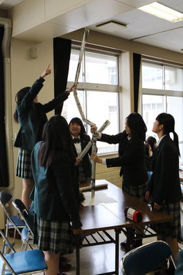 誕生月ごとに分かれたチームで新聞タワー作りに挑戦!新聞紙,セロテープという限られた材料でどれだけ高いタワーを作れるか,まだあまり話したことのない同級生と協力しながら活動していました。