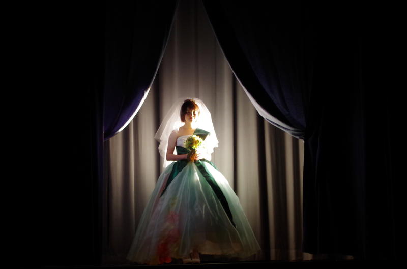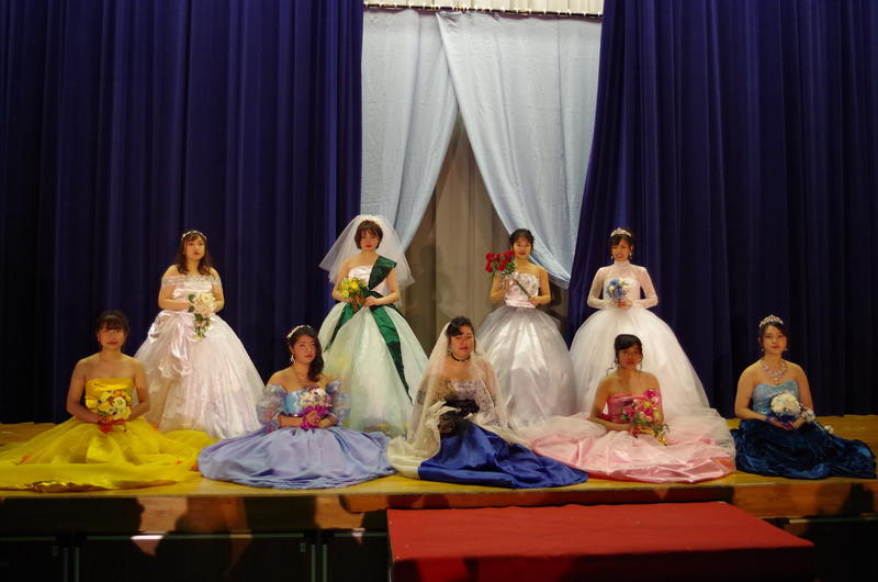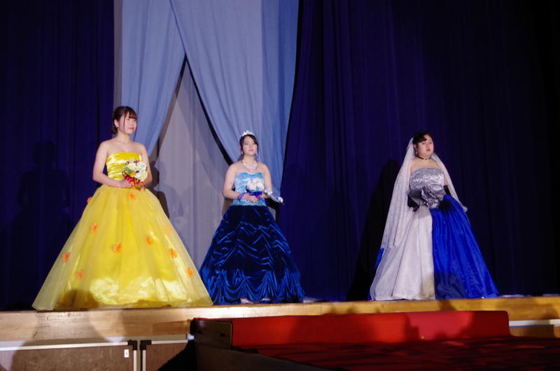 発表会のフィナーレを飾ったのは,家政科3年被服コースのファッションショーです。卒業製作の「ウェディングドレス」を身にまとい,スポットライトを浴びてランウェイを歩きました。