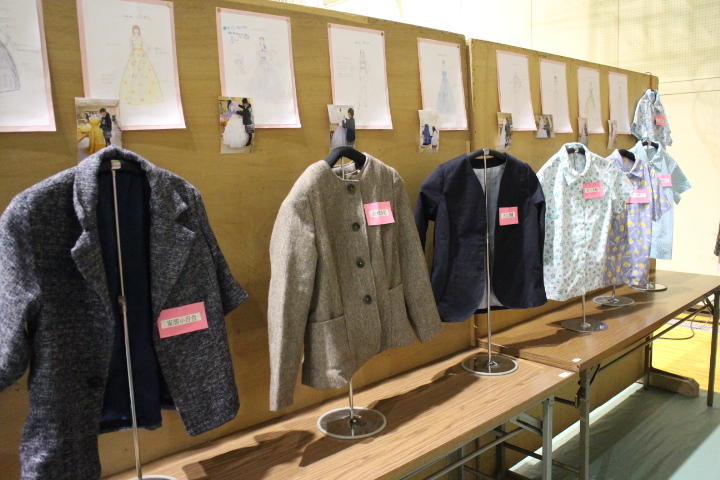 また,会場内では,被服コースの授業で製作した,ワンピースや浴衣,ジャケット,そして,ウェディングドレスのデザイン画と製作の様子などの展示があり,多くの来場者が足を止めて作品に見入っていました。