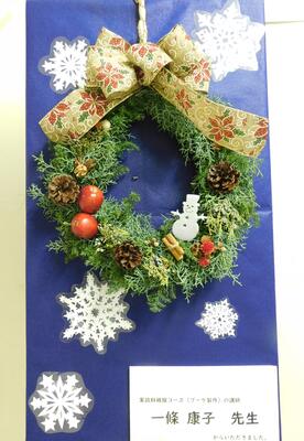 11月19日に家政科講演会の講師でお世話になった一條康子先生から,とても素敵なクリスマスリースを頂きました!全部生の植物で作ってあり,木の良い香りもしました。素敵なクリスマスプレゼントありがとうございました!