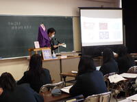 11月19日(木)家政科講演会を行いました。今年はマナコフラワーアカデミーの一條康子先生を招き「フラワーアレンジメントについて」講演していただきました。内容は,講話➔デモンストレーション➔体験の順に進みました。始めは一條先生が手がけたブーケやアレンジメントを一つ一つ紹介していただき,次に生花でアレンジメントのデモンストレーションをしていただきました。短時間で仕上がっていく様子を生徒達は静かに見守りました。最後に生徒達が1人ずつ「ミニフラワーケーキアレンジメント」の製作を行いました。同じ花材でアレンジしていますが,色が少し違う事や配置によって表情が変わることが面白いなと思いました。生徒は自分の作品が出来て嬉しそうでした。