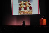 午後からは3年生が発表を行いました。3年普通科の生徒は,オープニングのスライドショーを行い,その後は司会やスポットライトなど運営スタッフとして活躍しました。3年家政科の生徒は,調理コースは今までの活動のスライドショーとケーキをはじめとした卒業制作の発表,保育コースは今までの活動のスライドショーと「アンパンマンマーチ」,「君をのせて」のハンドベル演奏,被服コースは自分でデザインし、製作したドレスのファッションショーを行いました。後輩たちも教室でオンライン発表を楽しみ,今年も素敵な発表会となりました。
